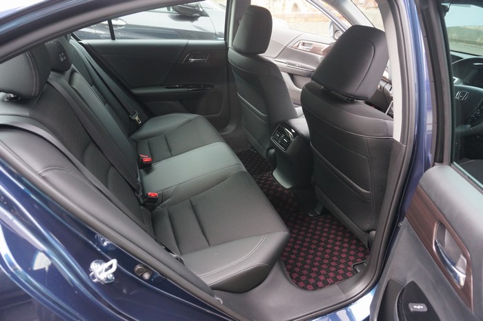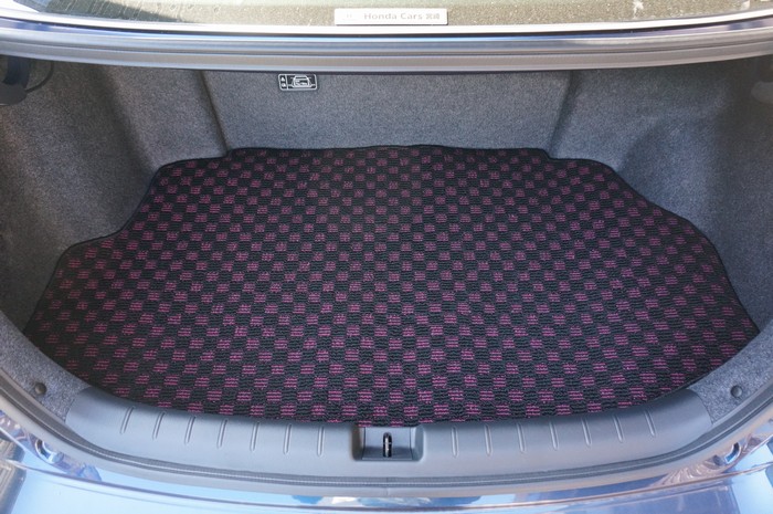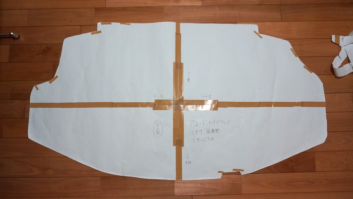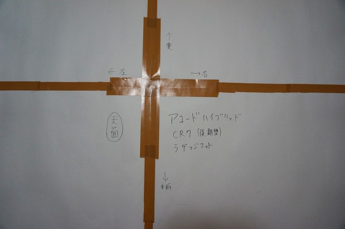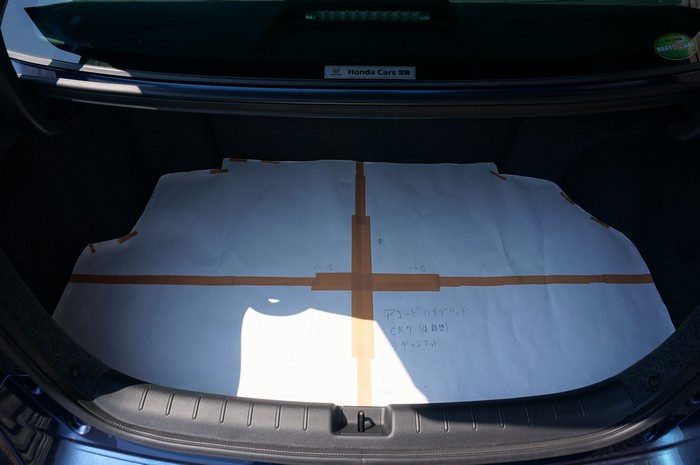 アコードのトランクルームの奥にはハイブリッド用の リチウムイオンバッテリーがあります。 後期型のCR7アコードはバッテリーが改良されて小型になりました。 前期型CR6のトランクと比べて若干ですがトランクが広くなりました。 フロアマットはアコードハイブリッド前期型(CR6)用で寸法が合うのですが トランクルームに敷くラゲッジマットはCR6用では寸法が合いません。 そこで自分で型紙を作ってFJ CRAFT様に特注します。 (特注にあたってFJ CRAFT様に事前に相談しました。) 型紙作りは初めてなので体当たりでやりました。