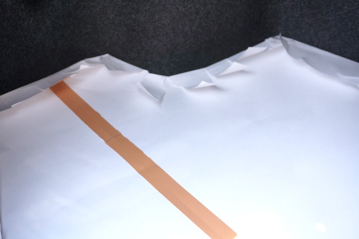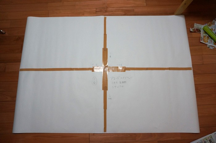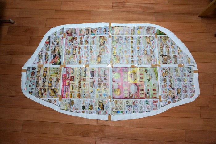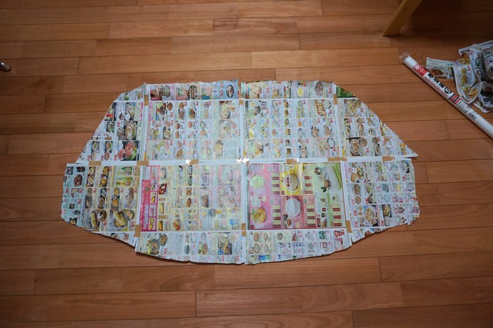 切り落としたり、敷いてみたり何度か繰り返して 折り曲げているときにちぎれた箇所を補修したりもして 型紙が出来上がりました。