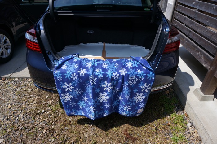 トランクの奥まで入って作業をするので バンパーにフリースを掛けて作業しました。 ********** 型紙を郵送して費用を見積もってもらい、注文しました。 昨日の晩に受け取りました!