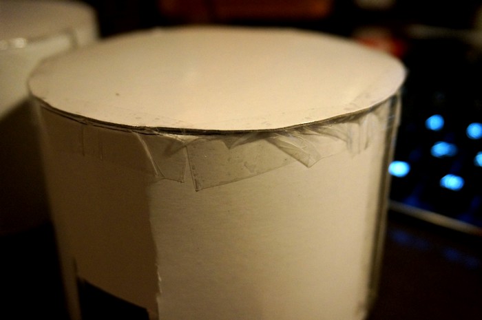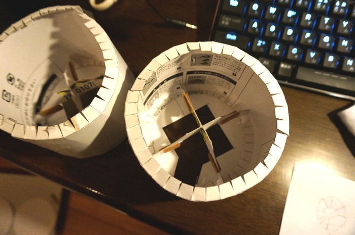 球体テストのスピーカーは、スピーカーから1メートル位離れて聴くと 低音が不足気味に聴こえるのですが、 耳元に近付けて聴くと、今度は低音が多すぎる感じになりました。 例えば高音質なヘッドホンを机に置いて ヘッドホンから1メートル位離れて音を聴くと 高音主体のシャカシャカした音になります。 耳元で聴くときと、離れて聴くときとでは 箱の大きさを変える必要があります。 ニアフィールド用には箱を小さめに作ったほうが良いだろうと思いました。 耳元で使うため、箱の角が肩に当たると痛いと思い円柱型にしました。 段ボール紙では円柱のカーブを作るのが難しかったため厚紙で作ることに。 [製作]