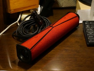 こんな具合です。 [感想] 手持ちのスマートフォン的な何かのヘッドホン端子からでは 最大ボリュームでも音量が足りず、 手持ちのBluetoothレシーバのヘッドホン端子のほうが 音量が大きかったのでつないで使っています。 それでも最大ボリュームで丁度良い位の音量です。 頭の廻りに小さな丸いホールが出来たような雰囲気で聴こえます。 取り付けたスピーカーユニットは低音寄りの音がします。 ですがユニット正面から聞くと、さすがに高音が目立ちます。 耳の穴がユニットの90度横に来る配置にしたことで、 高音が耳に付かず、低音がよく聞こえます。