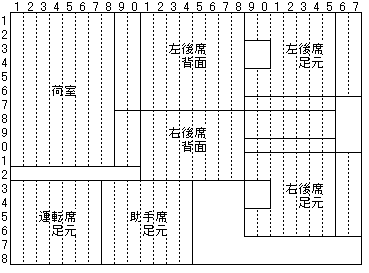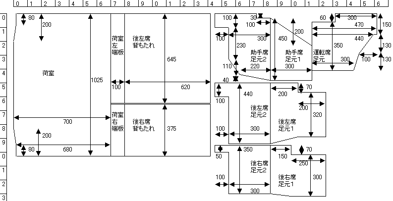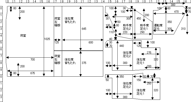 左から、運転席足元、後右席足元、荷室(後席収納状態)です。 試作品を敷いてみると、 数カ所、床の突起にぶつかる部分が見つかりました。 その部分を修正したのが、下の設計図です。