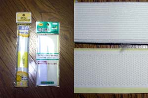 板状ゴムひもは、いわゆる「パンツのゴムひも」です。 こんなものをどこに使うのか?って??? これが無いと木製フロアマットは出来ません(^-^) マジックテープは、 後席背もたれに、木製マットを取り付けるのに使用します。 肝心の「フローリング風 マット」は、 DIYショップ等で売られている住宅用フローリングマットを利用します。