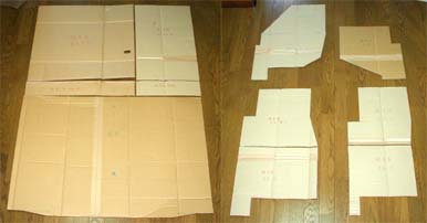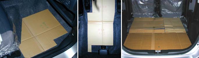 試作用の設計図を基に、 段ボール紙で実物大のマットを試作しました。左側が、荷室と背もたれ、 右側が、座席足下マットです。 試作品は、りんけんバンドのベスト盤を2回聴いているうちに 出来ました(^^;段ボール紙なので楽ちんです。 この試作品マットを、 ディーラーの展示車に敷いてみました。 なんせ納車は11月ですから(^◇^; ディーラーさん協力おしょうしなぁ(ありがとう)(^-^)♪