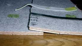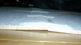 長いほうのゴムひもで、 荷室マットと端板をつなぎます。 ゴムひもの前後2センチに、 合成ゴム接着剤(コニシ ボンドG17等) を塗って、 板の方にも同じように塗って、