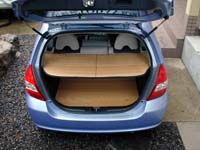 Fitの荷室の内張りに、 DIYショップで見つけた 「傘の先端のキャップ」を4個取り付けて、 その上に板を置いています。 (たまたま、傘の先端のキャップが、手頃な大きさだったもので(^^ゞ)@@ その静かさを確かめる @@