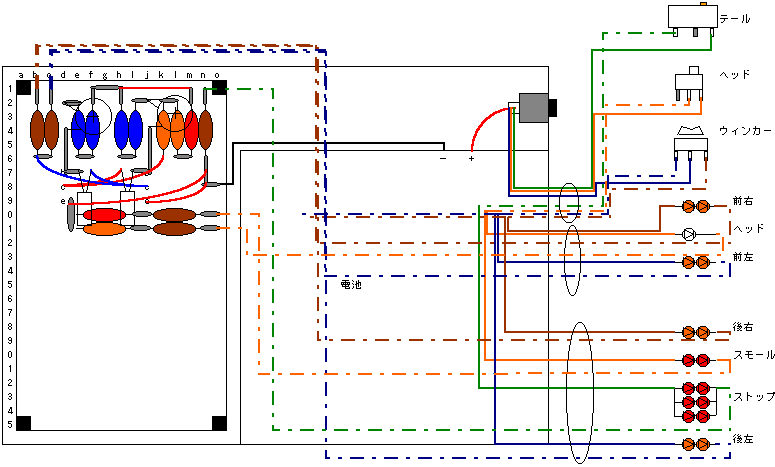 8ミリビデオテープケースに基板を入れるために、 基板をカッターナイフで切り落として小さくしました。 佐藤琢磨選手のF1初出走オーストラリアGPの中継を見ながら、 半田ゴテでコテコテすること数時間・・。 まず抵抗・・トランジスタ・・コンデンサ・・ジャンパー線多数(^◇^; いつのまにか佐藤選手はリタイアしてたみたいだ(T-T) 出来た基板に、ケーブルを取り付けます。 スイッチボックス系統・・前ランプ系統・・後ランプ系統。↑基板はケーブルで埋まってます(^◇^; 次に、スイッチボックスにドリルとヤスリで穴をあけて、スイッチ取付。 透明なケースなので中が見えてしまうから、 配線を三つ編みにしてみたり(^-^;