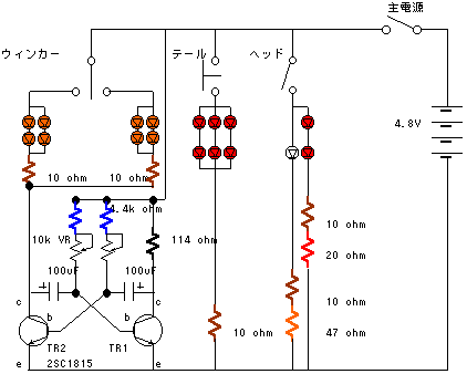 ウィンカーを点滅!・・どうやってさせよう(?_?) 方法その1:押しボタンスイッチをハンドルに取り付け、 カッチンカッチンと、 ソレっぽく指で押したり離したりする。 でも、これだと点滅にムラがあってミットモナイかも(T-T) 方法その2:電子回路で点滅させる。 これなら、本物そっくりに点滅できそう(^^) 生まれてこのかた30年、 電子回路を設計したことは一度もないけど、何とかなる・・かな? 豆球で光らせると・・、 ウィンカーが前後左右で4つでしょ、テールランプに1つ。 ・・単1電池4つ位積めば実用になるかな(T-T)消費電力が不安 ここは一発、 最近流行り?の高輝度LEDでランプを光らせよう! どうせ電子回路を組むんだからそうしよう! 消費電力少ないはずだから、単3電池でも大丈夫!(・・だろう多分・・。) ついでに白色LEDでヘッドランプも光らせちゃえ(^o^)! ヘッド点灯時はテールランプもスモール点灯だぁー(^O^)/~/~(←膨らむ膨らむ)@@ 回路の設計 @@