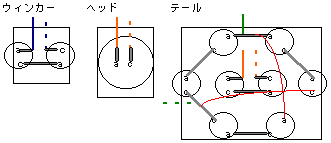 まず、電子回路の材料代が5000円ちょいでした。 内訳は、高輝度LEDの代金が3000円です。 (←ここが非常に大きい(T-T)) 基板やらケースやら、その他諸々が2000円。 そして、 やほお!競売で落札したオートバイ用テールランプ、ウィンカー部品が、 送料などを含めると5000円。 合計1万円も掛かってしまいました(^◇^; ああ、やっちもた(T-T)〜(やってしまった) ・・もし、回路が動かなかったら、 目も当てられなかったな(~~;動いてよかったー == 材料(参考) == 基板 サンハヤト汎用基板 25*15穴 @ 100円*2枚 LED 高輝度白色直径10mm3.5V20mA @ 680円*1個 高輝度橙色直径 5mm2.0V20mA @ 180円*8個 高輝度赤色直径5mm1.85V20mA @ 98円*8個 抵抗 10Ω 1/4W @ 10円*5本 20Ω 1/4W @ 10円*2本 47Ω 1/4W @ 10円*3本 2.2kΩ 1/4W @ 10円*4本 半固定抵抗 10kΩ @ 50円*2個 トランジスタ 2SC1815 @ 30円*2個 電解コンデンサー 6.3V 100μF @ 30円*2個 ケーブル イーサネット用(ツイストペア8芯)@ 120円*4m スイッチ 3P中立スイッチ @ 170円*1個 6Pスライドスイッチ2個(田宮) @ 100円*一式 マイクロスイッチ(オムロン) @ 100円*1個 電池ケース 単3*4本用 @ 180円*1個 本体ケース SONY8mmビデオ生テープケース流用 @ 235円*1個 スイッチケース ゼムクリップケース流用 @ 78円*1個 ウィンカー本体 YAMAHA SR400純正品4個セット @2100円*一式 テールランプ本体 HONDA STEED純正品 @1000円*1個