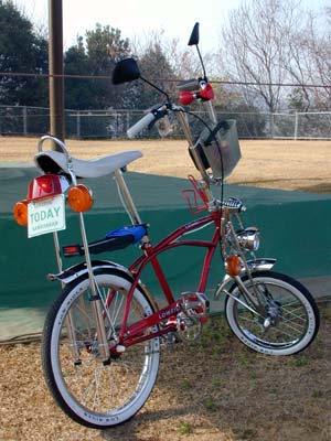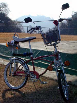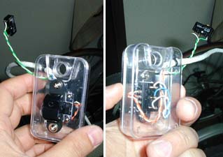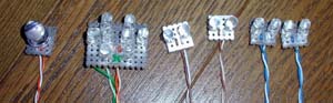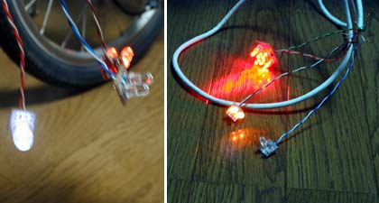 やほお!競売で、 本物のオートバイのテールランプ&ウィンカーを落札して、 届いたものを見てみると、 やたらでかい ことに気付きました(~~; テールランプはサドルの幅より広いし、 ウィンカーはヘッドランプと同じ位の大きさ。 400ccオートバイの部品を買ったのがまずかった(T-T) 原チャリ用にしておけば良かった。 とはいえ、 もったいないので、でかいランプを取り付けてみることにしました。 @@@@@@ ウィンカーを分解して、 ランプなどの要らない部分を取っ払い、 代わりにLED基板を両面テープで留めて。 LEDは光が真っ直ぐに進みやすく、周囲に広がりにくいので、 基板上のLEDの足をそれぞれ外側に向けて曲げ、 ウィンカーを光らせてみると、全体が光って良い感じ(^^) テールランプも以下同文。 ヘッドライトは、豆球ソケットをはずして、 その部分に白色LEDをアロンアルファで接着。 そしたら、アロンアルファが乾燥するときに周囲を白く曇らせる効果が、 白色LEDの表面を襲いました(ToT)曇りLEDになってしまったー @@@@@@ DIYショップで買ってきた、 いろんな金具を組み合わせて、 ヘッドライトとウィンカー、 テールランプとウィンカーを組み、自転車へ取り付けました。 配線も、ハンダ付けして収縮チューブで保護して、 タイラップでケーブルを車体に固定。 2002年3月7日午後10時、ついにデコチャリLEDランプ完成(^-^)!![]()