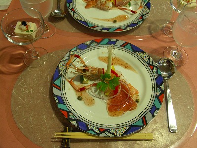 夕食です。海老が甘さと梅のソースの酸味と。 左上はゴマ豆腐のような?お味噌で頂きます。 | |