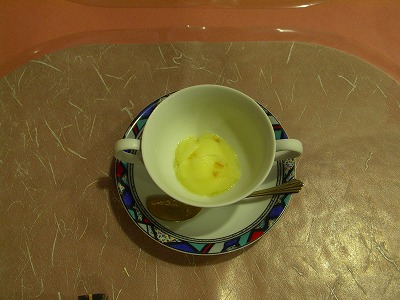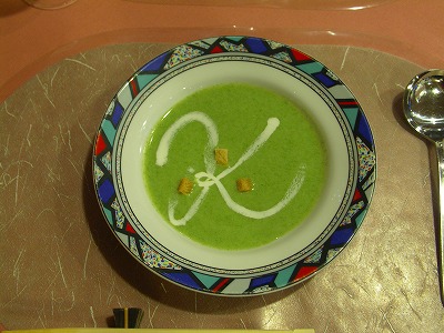 ほうれんそうのスープ。これがほうれんそう満開の味かと思いきや、 ビックリするほど出汁の味が勝っていてその鮮やかな色からは想像できないほどほうれんそうの味がしないので逆にビックリ。 | |
