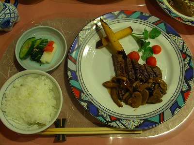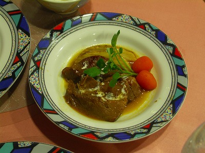 ステーキプランで宿泊しましたが、タンシチュープランも捨てがたい。 そこで追加でタンシチューを1人前注文(800円)して妻と分けて食べまし た。柔らかく肉の旨味が濃く感じられました。ステーキとタンシチュー、 両方を食べてみて、どちらか一つを選べと言われたらステーキを 選びます。 | |