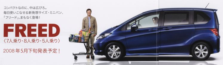 なんか、 イの字を分解するとリ、 ツの字の「゛」を隣に移動するとド、 ツの字の残りが「ー」になるじゃないか。 わざとかね。偶然かね。フで始まってトで終わる。 ホンダのヒトはフリードをフィット並の看板車種にしたいのだろうか? と考えるのは考えすぎかもしれない。 2008年5月10日「決戦3日目」 昨日、担当営業さんから ホンダの発注システムにコードが通る(=発注可能)ようになった と連絡がありました。 フリード公式サイトもオープンして、いよいよです。 今日の午前中に3度目の契約交渉に臨みました。 お店に到着すると、ティーザーキャンペーン用チラシ(封筒用)を 見せてくれました。 特に珍しい情報が載っていた訳ではないのですが、 新たな発見が1つありました。