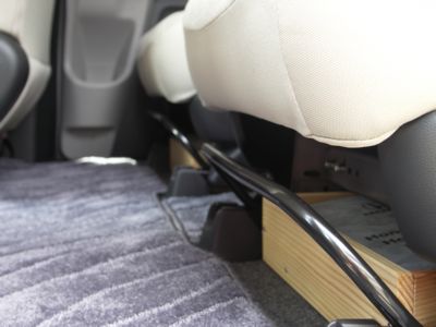 【3列目の下に荷物を仕舞う。】3列目の席の下に物を置いたときに、 室内に物が転がり込まないように仕切り板を付けました。 どんなものを作ったのかと言うと、