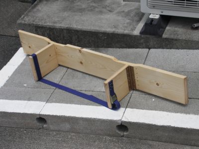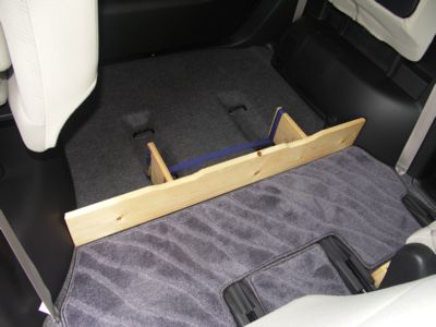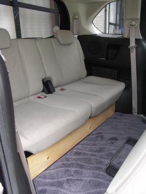 こんなものを作りました。 長い板に、小さい2枚の板が蝶番で繋がっています。 小さい2枚の板同士が、ナイロンバンドで繋げられるようになっています。 コレを、3列目を両側とも跳ね上げて床に置きます。