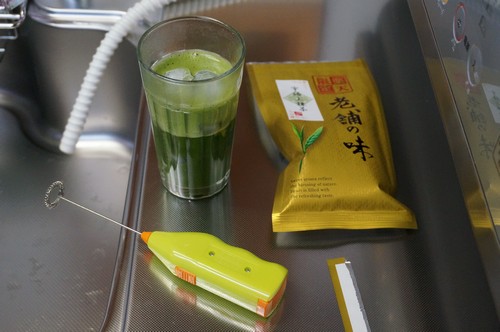 2015年5月23日「冷たい抹茶」 抹茶アイスクリームなどの、 抹茶の混ざった甘いお菓子が苦手なんです。 抹茶と和菓子のセットがあると、 ブラックコーヒーを差し置いて注文してしまいます。 抹茶そのものは好きなんです。甘くなった抹茶が苦手なんです。 コーヒーが好きなヒトに、 コーヒー味の飴をあげると嫌な顔をされるのと同じ原理です。 飲物としての抹茶が好きなので、 この際、茶道の難しい話は忘れてしまって、 ブラックコーヒーのように抹茶を気軽に楽しんでいこうと思いました。ダイソーでミルクフォーマーを買ってきました。 ありえない色で躊躇しました。