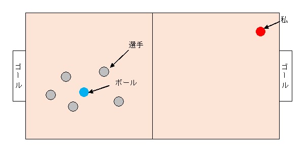 2019年9月21日「体育の授業」 高校の頃、体育の授業でラグビーかサッカーかの試合がありました。 私は運動会の徒走では、他の者に倍以上の大差をつけて 最下位でゴールするほど足が遅かったので 全力で走ってもボールはもちろんのことボールを追いかける他の生徒にも 追いつけないことは明白でした。そのため試合中は図の赤丸の、フィールド内観客ポジションに居ました。 ボールや選手が、あっちに行ったりこっちに行ったりするのを 遠くから眺めて過ごしました。 たまに自分の方にボールが転がってくると困りました。 ボールが来ないことを祈りながらじっとしていたのですが ときどきその場で足踏みしたりしました。 この図を書いていて、私の所属するチームは1人選手が少ない状態で 不利な戦いを強いられていたことに気付きました。 皆、私の運動能力の低さを知っていたのか 誰からも文句を言われたことはありませんでした。