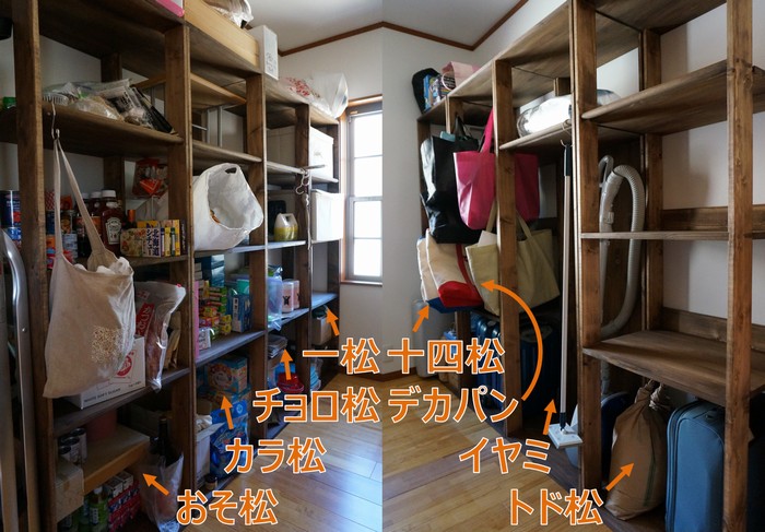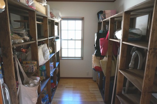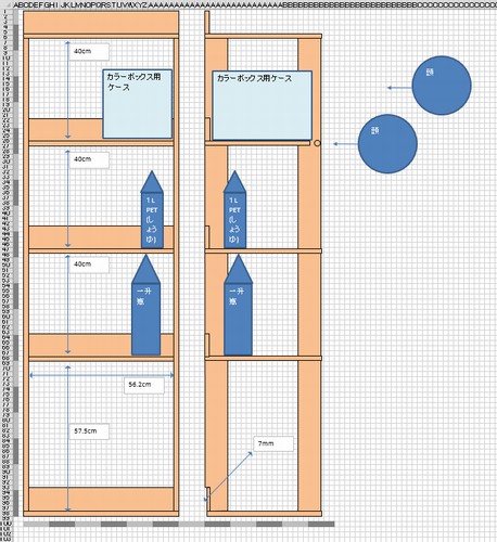 日用品棚 ・動機 食料品や日用品を、 安売りのときに大量に買ってチビチビ使っています。 そのような買い置きの物のほか、文房具や掃除道具も、 台所の隣にある室内物置に置いています。 これまで鉄の棚を使ってきたのですが、 昨年、外に物置を置いたので、鉄の棚を外の物置に移して使い、 室内物置用の棚を木で作ることにしました。 ・工夫した所・上3段は一升瓶の高さを参考に内寸を40cmにしました。 下1段は機内持込キャリーバッグが収納できる高さにしました。 ・1段に市販の3段ボックス用の箱が2つ、 ちょうどよく入る幅にしました。 ・2段目の棚板を短くし、 S字フックを掛けられる丸棒を付けました。