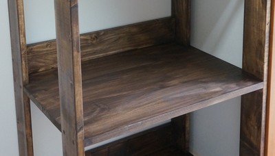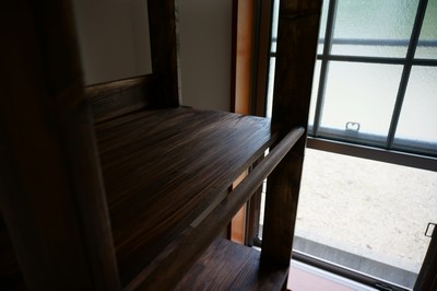 日用品を満載しても困らないように、 少しでも強度を増そうと思って、 大入れ接ぎ+コーススレッド+接着剤でつないでいます。 ドゥーパの本に載っていた大入れ接ぎ用の溝ほりガイドを作って、 トリマーで溝を掘りました。 トリマーは大変危険な道具なので保護メガネをつけたり、 使用中に板が動いて手が滑ったりしないよう固定したり、 作業準備に時間を掛けました。 ・材料と費用 パイン材集成材と1x4材と、丸棒少々。 底板と背面にダイソーの傷防止フェルトを貼りました。 カンペハピオのプラスウッド(ウォルナット) という塗料を塗っています。 1台の材料費は9千円位です。 これと同じ棚をあと5台、 同じ外寸の掃除機置きやバッグ掛けも設計してあって、 合計あと7台作る予定ですorz ・完成 (2015年2月14日) 体調の良い日に少しずつ作って、1年間掛かりました。