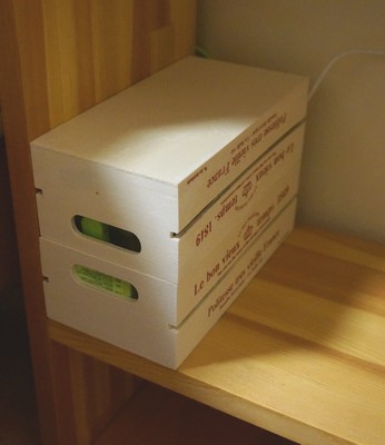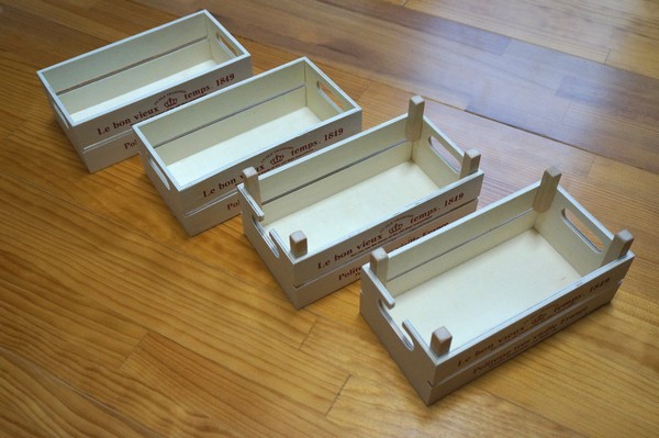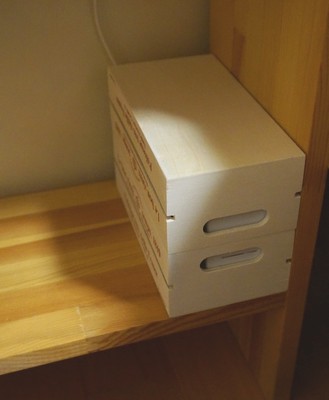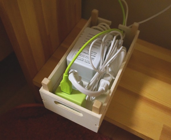 セリアで買った木箱 108円 * 4個 = 432円 家に転がっていた角棒 57円 * 1本 = 57円(ホームセンター) (60cmの棒の内40センチを5cm*8本にして使用) 木工用ボンド 少々 計 489円+ボンド代 = 約245円/1台 ・設置 まず妻のベッドサイドテーブル。