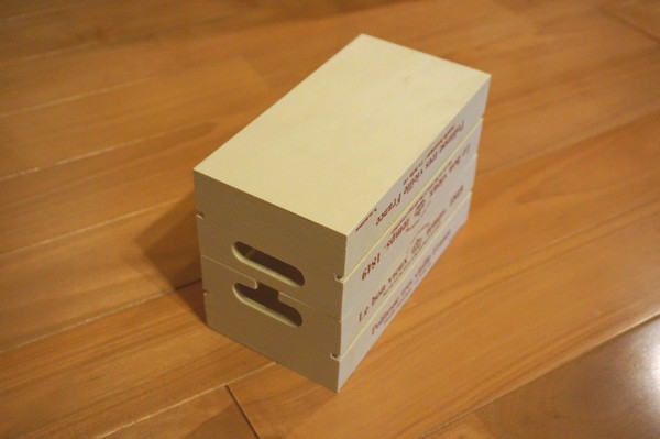 テーブルタップボックス ・動機 ベッドサイドテーブルで使うUSB機器が増えてきて、 USB充電器やUSBケーブルが増えました。 ゴチャゴチャしてきたのでテーブルタップボックスを作って、 配線を片付けつつ、物が置けるスペースを増やします。 ・工夫した所 セリアの木箱を2個使って、フタと底にしました。フタの固定に蝶番を使わず、角棒にはめ込みました。 ・製作 底になるほうの木箱の、取っ手の片方を一部切り落とし ヤスリでならしました。