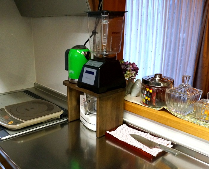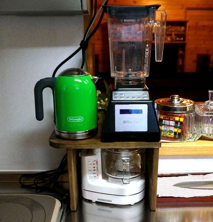 ミキサー台 ・動機 我が家にフードプロセッサー(ミキサー)があるのですが 流し台にはジューサーミキサーと電気ケトルがあって もうフードプロセッサーを置く場所がありません。 そこで、ジューサーミキサーと電気ケトルを台に置き、 その下にフードプロセッサーを置けるようにしました。・工夫した所 テーブルの一部を飛び出させることで設置面積を小さくして 流し台の作業スペースを広げました。 木材が水を吸って腐るのを軽減するため塗装を入念にして クッション足を貼りつけて木の部分を宙に浮かせました。