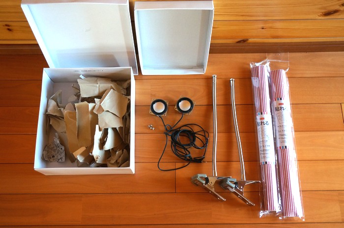 昨年末に妻が新しい靴を買いました。厚紙(1mm)の空き箱をもらいました。 ダイソー300円USBミニスピーカーのユニット、 ヤザワの"どっちもクリップ"の片方を分解したもの、 ダイソー貼れる布、4ミリのボルトナット、紙くずです。