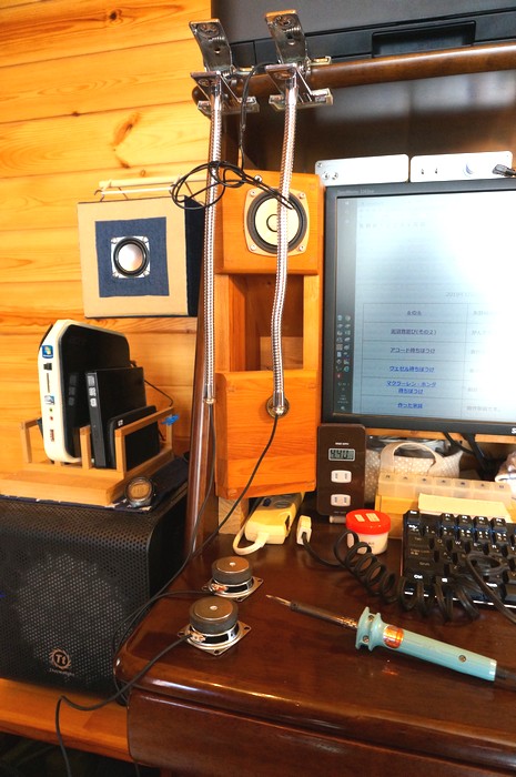 お昼寝マシーン完成。 [後書き] 変化球の3号機。 ストライクかボールかと言われれば、三振を狙うボール球。 固定具の耐久性が低くて、今にも壊れそうです。 思えば1号機はユニットが脱落したし。 壊れたら金具と段ボール紙に変えると思います。 ダイソー300円ユニットで、これまで何個か作ってきて 経験から得たノウハウが少し身に付いてきました。(どこがじゃ!!) 次の4号機では、直球ストライク、2号機超えを目指して 8cm級ユニットに移るつもりです。今より箱が大きくなると思います。 2、3号機の良い音に満足してしまっているため 4号機は時間を掛けて、使うユニットや大きさを検討して作ります。 座卓パソコンデスクのバックロードホーンの使い道が無くなってきました。 [注意点] この記事をご覧の皆様の中には、 私も純セレブスピーカーを作ってみよう! と思う方がいらっしゃるのではないかと思います。 そのときに、作る上で注意してほしいことがあります。