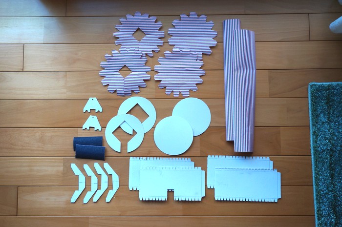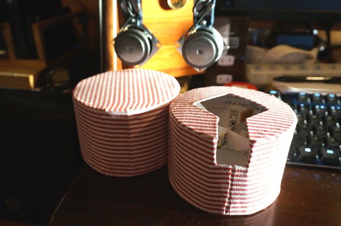球体テストのスピーカーは、スピーカーから1メートル位離れて聴くと 低音が不足気味に聴こえるのですが、 耳元に近付けて聴くと、今度は低音が多すぎる感じになりました。 例えば高音質なヘッドホンを机に置いて ヘッドホンから1メートル位離れて音を聴くと 高音主体のシャカシャカした音になります。 耳元で聴くときと、離れて聴くときとでは 箱の大きさを変える必要があります。 ニアフィールド用には箱を小さめに作ったほうが良いだろうと思いました。 耳元で使うため、箱の角が肩に当たると痛いと思い円柱型にしました。 段ボール紙では円柱のカーブを作るのが難しかったため厚紙で作ることに。 [製作]