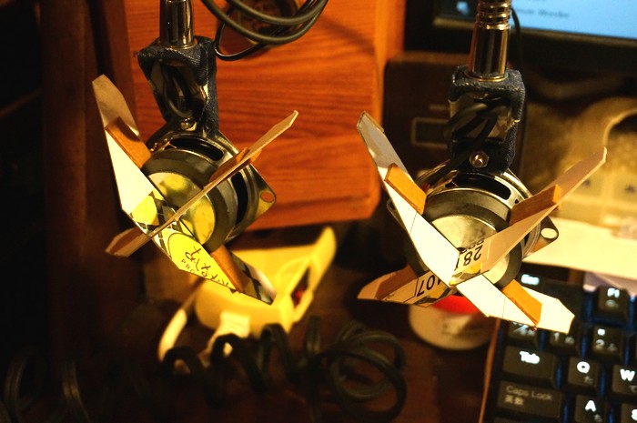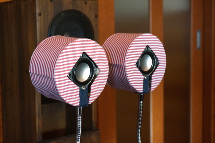箱の中の筋交いを磁石にハメ込んで完成。 クリップ付きフレキ管がスピーカー台、 ユニットがスピーカー本体で、箱はパッシブラジエターのような役割。 紙くずは若干多めに入れています。