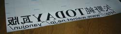 型紙の裏にスプレー糊を吹き付けて、貼り付けました。 (スプレー糊は、一度貼ると剥がれないタイプを使用。) 次に、デザインナイフで文字を切り出します。