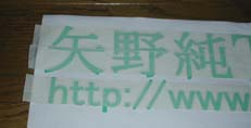 カッティングシートの裏面の紙に、 型紙を貼り付けて文字を切り抜きます。 切り抜いた文字を、 フィットのリアガラスに貼ると、 こんな風になる・・予定です(^-^)水色の車体に、 薄い黄緑色の文字を貼る予定です。 で、 薄い黄緑色のカッティングシートを買うべく 某カー用品店バックス 某郊外型大型文具店 某DIYショップ に行っても、 純色の緑色しか売っていませんでした(ToT)さすが延岡 延岡はおろか、 宮崎はおろか、 我が九州には、東急ハンズは有りません(T-T)〜 そこで、 カッティングシートを切売通販しているページで 買いました。 カッティングシートの裏面に、 型紙を貼り付けます。