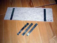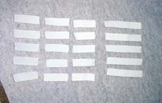 ↑荷室マット完成状態です。 @@@@@@ 後席背もたれ裏のマットは、 マジックテープで、フィットの背もたれ裏面に固定します。 まず、マジックテープのオス側を、 5センチに切ったものを12個準備します。