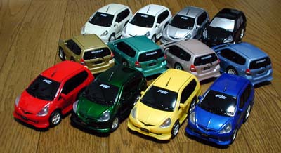 TTCエンタープライズの@car110 HONDA Fit 12色セットが 届きました。 全長11センチのプルバック・ミニカー(チョロQみたいに引くと走る)です。 例の10色に、JAZZっぽい深緑と、 発売が待ち望まれる(←矢野純的に) 濃い黄色が追加された12色セットです。 例の10色ですが、 メーカーのHPでは、「ボディカラーは当社のオリジナルです。」 とのことで、ホンダ純生色とは違います。 が、 アイスブルーなどは、 某ホンダダイレクトマーケティン○のミニカーよりも 色再現度が高いです(☆o☆) でも、オーキッドイエローが、なぜかメタリック色になっていて、 まるで金キャバかという色になってます。 濃い黄色のFitが、ものすごくカッコイイです。 やはりFitは、近年稀にみる黄色の似合う車だと(^^) みなさん、全塗装するなら黄色しかありませんっ! で、 この12色セット、新春特価で5832円と、 一個あたり約500円の代物なのですが、 1個500円のミニカーとしては非常にクオリティー高いです(☆o☆) でも、やっぱりチョロQも全セット買うもんねぇ(T-T)♪(←ばか)