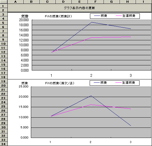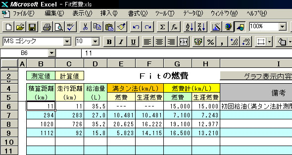 マイクロソフト エクセル(バージョン:95以降)用の、 燃費管理シートを作りました。ガソリンスタンドに寄った時に、 積算距離計(オドメーター)の値 ガソリン給油量 Fitの燃費計の値 をメモしておいて、 この表に入力すると、 満タン法での燃費&生涯燃費 Fit燃費計での生涯燃費 を表示してくれます。 生涯燃費とは、 Fitを買った時から今日までの通算燃費です(^-^) また、 がんばった結果をグラフ表示してみることも(☆o☆)