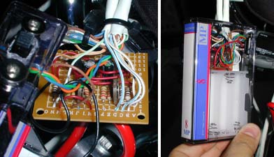 8ミリビデオテープケースに基板を入れるために、 基板をカッターナイフで切り落として小さくしました。 佐藤琢磨選手のF1初出走オーストラリアGPの中継を見ながら、 半田ゴテでコテコテすること数時間・・。 まず抵抗・・トランジスタ・・コンデンサ・・ジャンパー線多数(^◇^; いつのまにか佐藤選手はリタイアしてたみたいだ(T-T) 出来た基板に、ケーブルを取り付けます。 スイッチボックス系統・・前ランプ系統・・後ランプ系統。↑基板はケーブルで埋まってます(^◇^; 次に、スイッチボックスにドリルとヤスリで穴をあけて、スイッチ取付。 透明なケースなので中が見えてしまうから、 配線を三つ編みにしてみたり(^-^;
