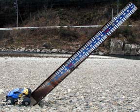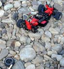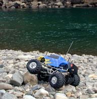 TXT-1を走らせる。 石がゴロゴロしている河原で遊んできました。 私のTXT-1は、スピードは全然出ませんが、 4輪が接地していれば、30度位の急坂でも平気です。 拳大の石がゴロゴロしていても平気に走ります。 4輪操舵仕様でのコーナーリングは、軽快です。 ステアリングサーボは、プロポセットに付属している標準タイプ のものを使っています。 トルクが足りないため、TXT-1を停止した状態では、 ハンドルを切ってもまるでタイヤが動きません。(サーボが唸るのみです) でも、走行しながらハンドルを切れば、軽快に曲がれます。 そういう意味では、無理にハイトルクサーボを買わなくても良いように 思います。 フルスピードで走行しながらハンドルを急に切ると横転しますが、 普段は至って扱いやすいです。 バッテリー4本(ツインバッテリー仕様なので2*2本です。)で、 1時間ほど走らせる事が出来ました。 フルスピードで走らせることは殆どなく、 ゆっくりと、4輪接地を維持しながら難所を越えて遊んでいました。 真冬だったからか、 モーターも、減速機の放熱板も、アンプの放熱部も、バッテリーも、 ほとんど温まりませんでした。 1アンプ仕様ですが、一度も過負荷トリップしませんでした。 負荷が掛かるような走らせ方をしていないからかも・・。 このページで読んだからって 真似しないでねぇ(T-T)壊れてもしらないよぉ〜 TXT-1の様子