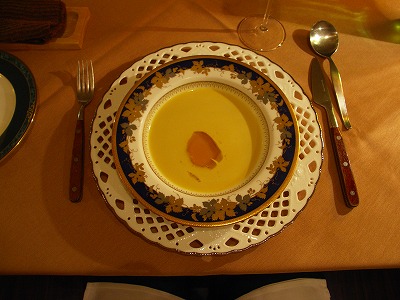 南瓜の冷製スープ。かぼちゃとコーンポタージュの味。 浮かんでいるのはコンソメゼリーで、味の変化が楽しめます。 | |