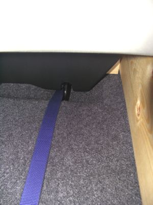 運転席側にはパンク修理キットがあるのでフットレストのみ、 助手席側は、小物入れ付きです。 で、置いて座ってみたんですが、若干設計ミスというか、 角度が強すぎて、つま先スペースが少なくなりすぎてしまい逆に窮屈です。 フットレスト、もう一度手を入れなければ実用になりませんです。
