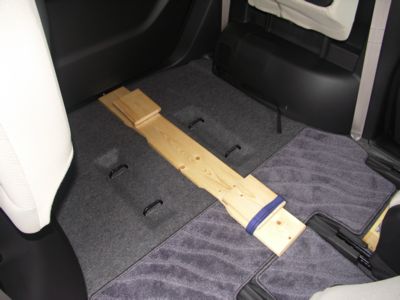 こんなものを作りました。 長い板に、小さい2枚の板が蝶番で繋がっています。 小さい2枚の板同士が、ナイロンバンドで繋げられるようになっています。 コレを、3列目を両側とも跳ね上げて床に置きます。