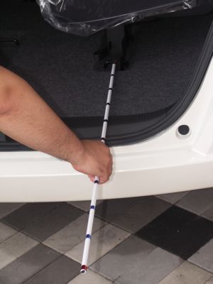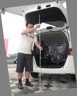 皆さんこんにちは、矢野純です。 さて今回、話題の中心にする車は「ホンダ フリード」の展示車です。それではこの、測る棒で荷室を測ってみたいと思います。